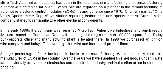 We were the first company to offer an OBD-II remanufacturing program. Today we offer the latest in flash prom programming. Beyond our basic and co-manufacturing business, we bring a well-rounded product offering to the traditional and two step distribution chains . Our product offering consists of: ECMs, including our famous Trooper Charger; MAF sensors; ignition wire sets; ignition wire tune-up kits; ignition component parts; as well as a separate catagory for Fleet vehicle ignition wire and ignition component products . Our accounts are sold and serviced by 12 manufacturer rep agencies. These agencies include over 100 salesmen that covers the continental United States, Puerto Rico, and portions of Mexico. |