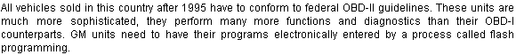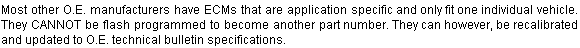 do some of our competitors, as many of the top names in electronics use Micro-Tech to supplement their own programs. Another feature of the GM unit is that a new or remanufactured unit can be flash programmed to become another part number. There are a number of companies that manufacture flash programming equipment and are available to the aftermarket. However this is not a job for the amateur, as the ECM can be destroyed if the wrong numbers or programs are accidentally entered. OBD-II ELECTRONIC CONTROL MODULE |