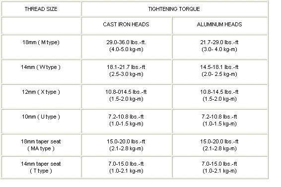 C.) USING YOUR FINGERS, SCREW THE SPARK PLUG INTO THE CYLINDER HEAD FINGER TIGHT AND THEN TIGHTEN ABOUT 1/ 4 TO 1/ 2 A TURN MORE WITH PLUG WRENCH, ABOUT 1/6 OF A TURN ON TAPERED SETS. D.) OVER TIGHTENING CAN DISTORT THE SPARK PLUG SHELL OR CRACK THE PORCELAIN CAUSING THE PLUG TO MISFIRE.SPARK PLUG TIGHTENING SPECIFICATIONS: IF A TORQUE WRENCH IS AVAILABLE, TIGHTEN TO THE BELOW LISTED SPECS. THIS IS VERY IMPORTANT, PARTICULARLY WITH ALUMINUM CYLINDER HEADS .